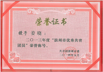 大会同时评选出二〇一三年度先进个人及团体,我集团姜晓同志被授予全市“优秀共青团员”荣誉称号。